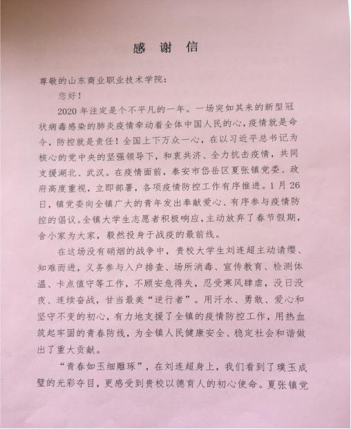 近日,山東商院收到了一封來自泰安市岱岳區夏張鎮的感謝信,信中對學院劉連超同學在當地疫情防控工作中的付出與貢獻表示感謝。