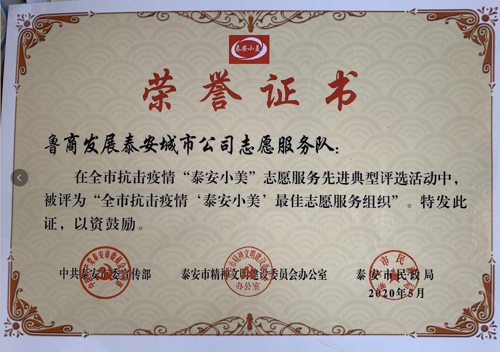 責任國企,抗疫先鋒。近日,魯商發展泰安城市公司志愿服務隊榮獲由泰安市委宣傳部、市民政局頒發的“泰安小美”最佳志愿服務組織獎。