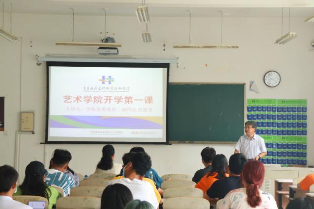 宮恩龍以《風雨無阻向前進》為題,為返校學生講授“開學第一課”,他向同學們介紹了學院守好“責任田”,護好“一院人”,全力打贏疫情防控阻擊戰的基本情況,引導同學們要做堅定的愛國者、有良心的感恩者、健康的守護者和規則的遵守者。藝術學院院長朱廣麗就新學期藝術學院的課程設置、專業發展向同學們作了介紹。