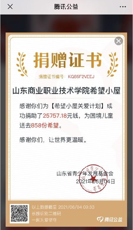 除此之外,山東商院積極響應(yīng)團(tuán)省委號召,聯(lián)合各二級學(xué)院開展了騰訊公益線上募捐活動,活動自開展以來得到了全校廣大青年學(xué)生的大力支持,大家紛紛獻(xiàn)出愛心,共籌得善款13592元。截至目前,線上線下共籌得善款25757元,均已捐贈給山東省青少年發(fā)展基金會。