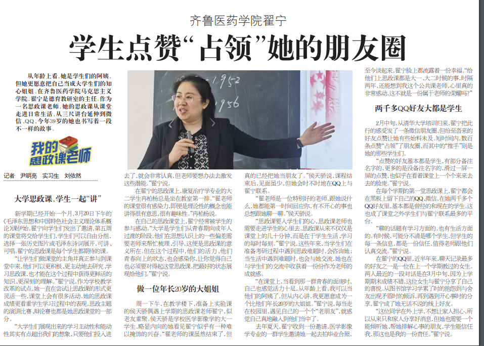 從年齡上看,她是學生們的阿姨,但她更愿意把自己當成大學生們的知心姐姐。在齊魯醫藥學院馬克思主義學院,翟寧是德育教研室的主任。作為一名思政課老師,她的思政課從課堂走進日常生活,從三尺講臺延伸到微信、QQ,今年39歲的她也書寫著一段不一樣的故事。