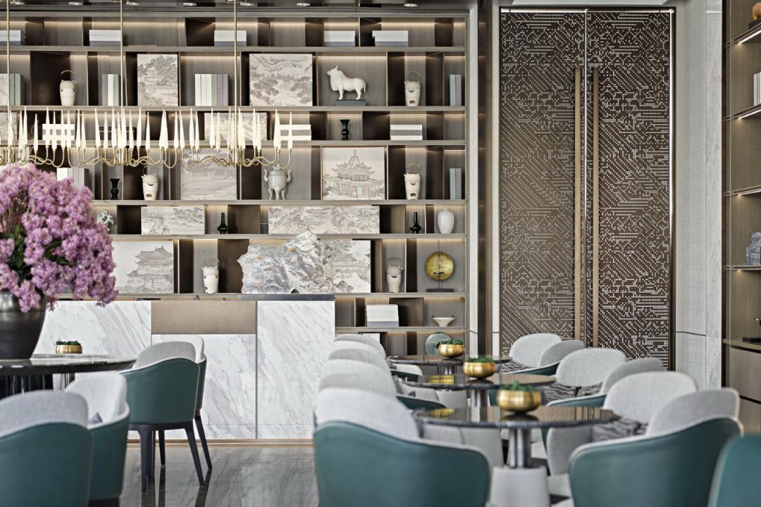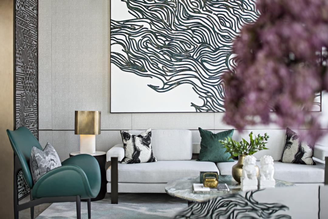 魯商藍岸公館展示中心由飛視設計公司所設計,以中央為展示區,分為四種不同風格的洽談空間。接待大廳以花穗造型的藝術裝飾燈具緩緩垂墜,與粉黛牡丹互為點綴,共襯大理石巖紋自然的紋理,一同呈現出人文與自然之美。(文/王彥斌)