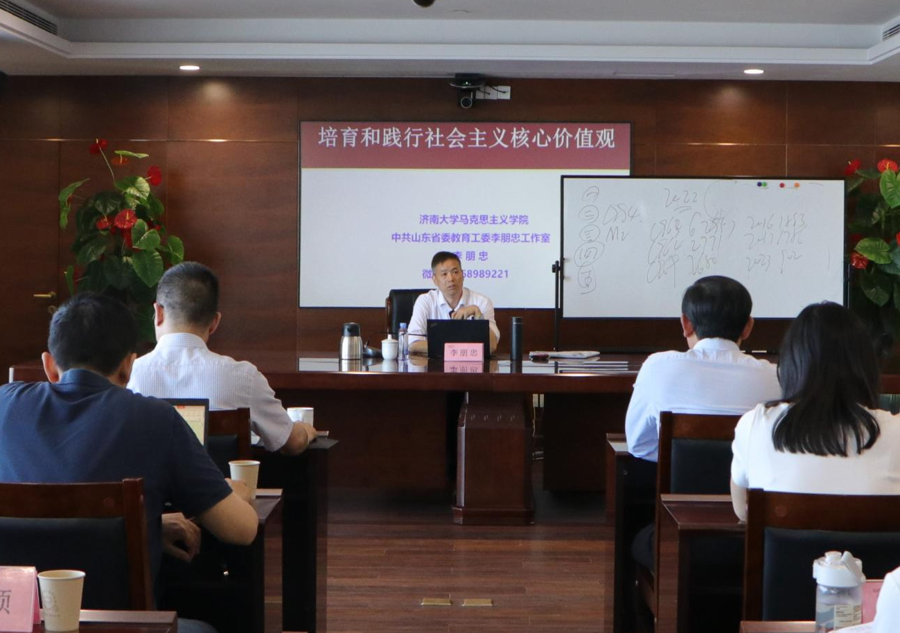 4月25日,由省委宣傳部會(huì)同有關(guān)省委省直部門組織開展的山東省培育和踐行社會(huì)主義核心價(jià)值觀宣講走進(jìn)魯商集團(tuán),宣講團(tuán)成員、濟(jì)南大學(xué)李朋忠教授進(jìn)行專題宣講。集團(tuán)黨委副書記、董事張洪東出席。