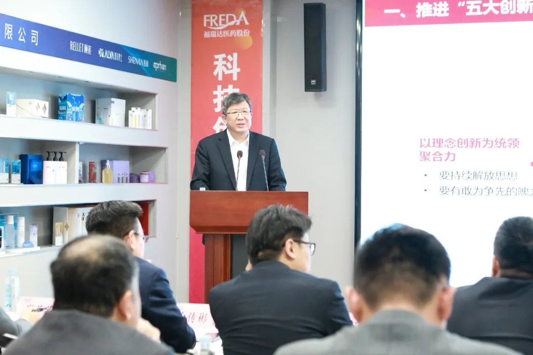 賈慶文作題為《錨定“走在前、挑大梁” 奮力“下實功、見實效” 推動高質量發展新躍遷》的講話。他指出,2024年,福瑞達在集團黨委的堅強領導下,務實篤行、銳意進取,各項工作提速提質提效,向穩有韌性,向高有突破,向質有提升,向新有動力。同時,要正視在思想解放、機制創新等方面的問題,切實補足短板。要順應趨勢、內求超越,看“形”和“勢”強信心,看“質”和“量”明方向,看“新”和“變”練內功,把握產業轉型升級新機遇。2025年福瑞達要認真落實集團年度工作會議部署,一是推進“五大創新”,以理念創新為統領,“科技+機制”雙輪驅動,培育新質生產力;“模式+業態”雙向升級,培育跨界融合消費業態,搶占首發消費力。二是全面深化改革,構建高質量發展體系。完成國有企業改革深化提升行動,打造生物股份國家“科改企業”樣板。強化賦能型總部建設,提升運營管理和數字化水平,驅動業務增長。三是爭創行業一流,塑造高質量發展品牌。深化尋標對標爭創一流工作,落實集團“六個品牌”建設要求,建立集團品牌、業務品牌和產品品牌“三維一體”品牌管理體系。四是強化黨建引領,積蓄高質量發展動能。壓實黨建工作責任,夯實黨建基層基礎,抓實全面從嚴治黨,大力弘揚“用心、務實、盡力”的工作作風,形成搶挑重擔、履職盡責的創業氛圍,為集團全面打造綜合競爭力強的現代商業服務領軍企業作出新的更大的貢獻。