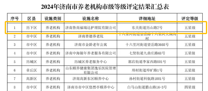 近日,濟南市養老服務設施等級評定委員會揭曉2024年市級等級評定結果,濟南魯商福瑞達護理院再度榮膺“五星級養老機構”稱號,這也是自2017年開業以來連續第七年蟬聯此殊榮。