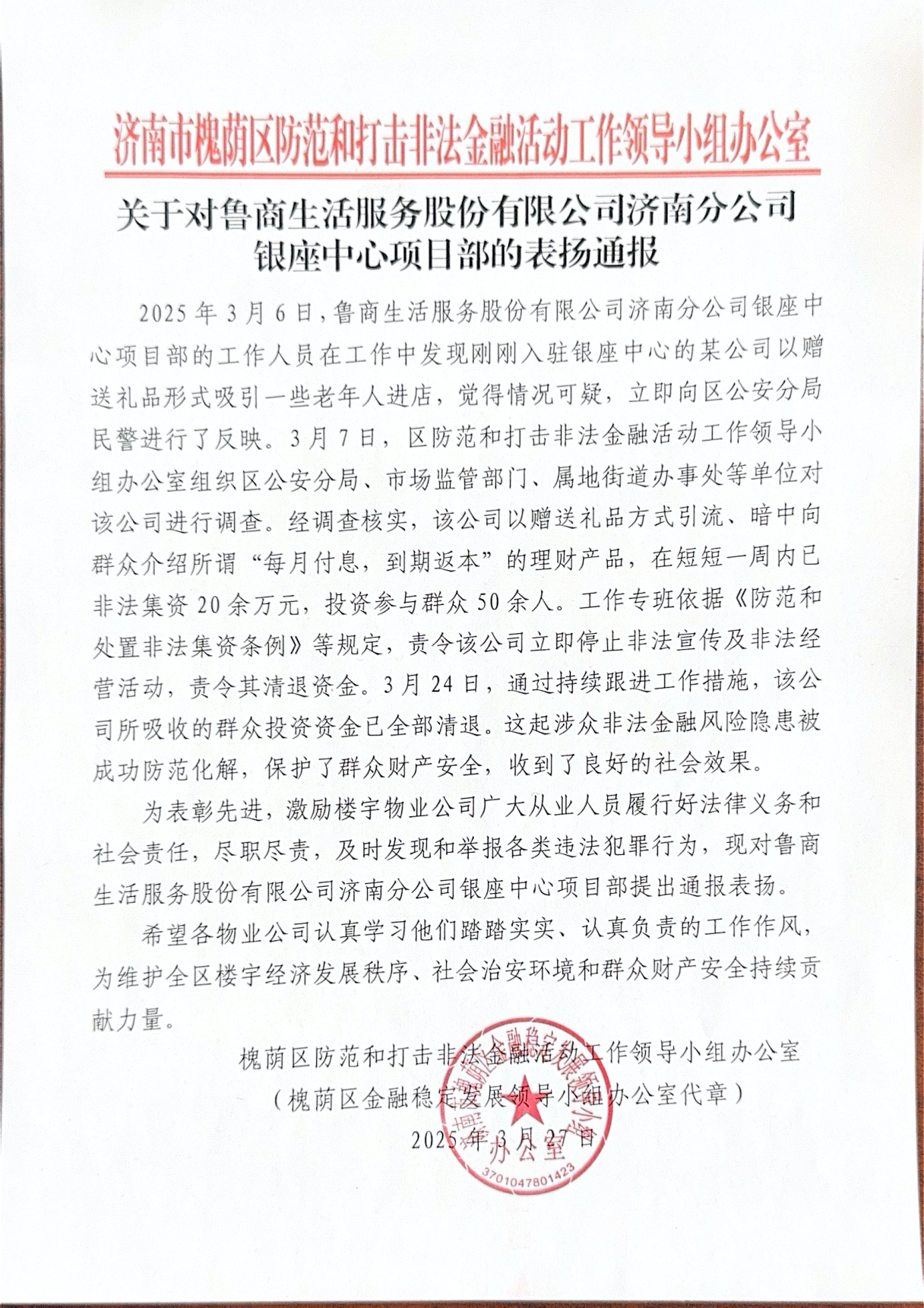 近日,魯商服務濟南銀座中心受到濟南市槐蔭區金融穩定發展領導辦公室的通報表揚,高度贊譽項目團隊在防范非法集資活動中的表現。