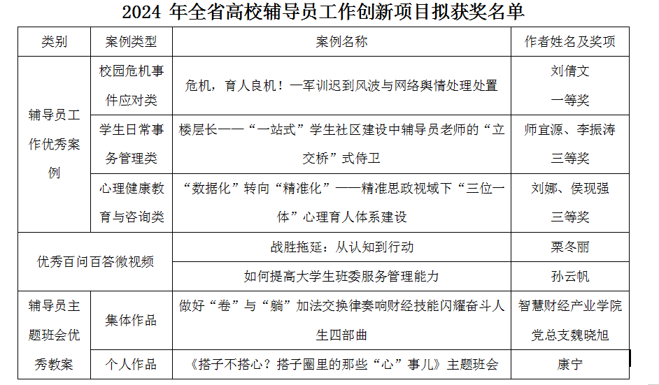 近日,山東省教育廳公布了全省高校輔導員工作創新項目評選結果,經組織推薦、資格審核、專家遴選等程序,山東商職學院獲評2024年輔導員工作優秀案例一等獎1項、三等獎2項,優秀百問百答微視頻獲獎2項,輔導員主題班會優秀教案集體作品和個人作品各1項。