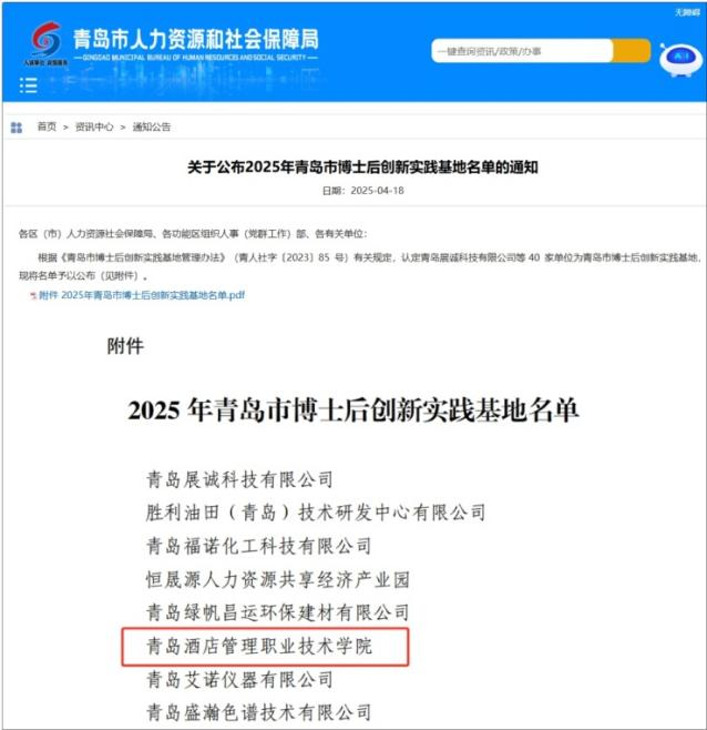 近日,青島市人力資源和社會保障局公布了2025年青島市博士后創新實踐基地名單,青島酒店管理職院成功獲批,高層次人才載體建設取得又一重要突破。