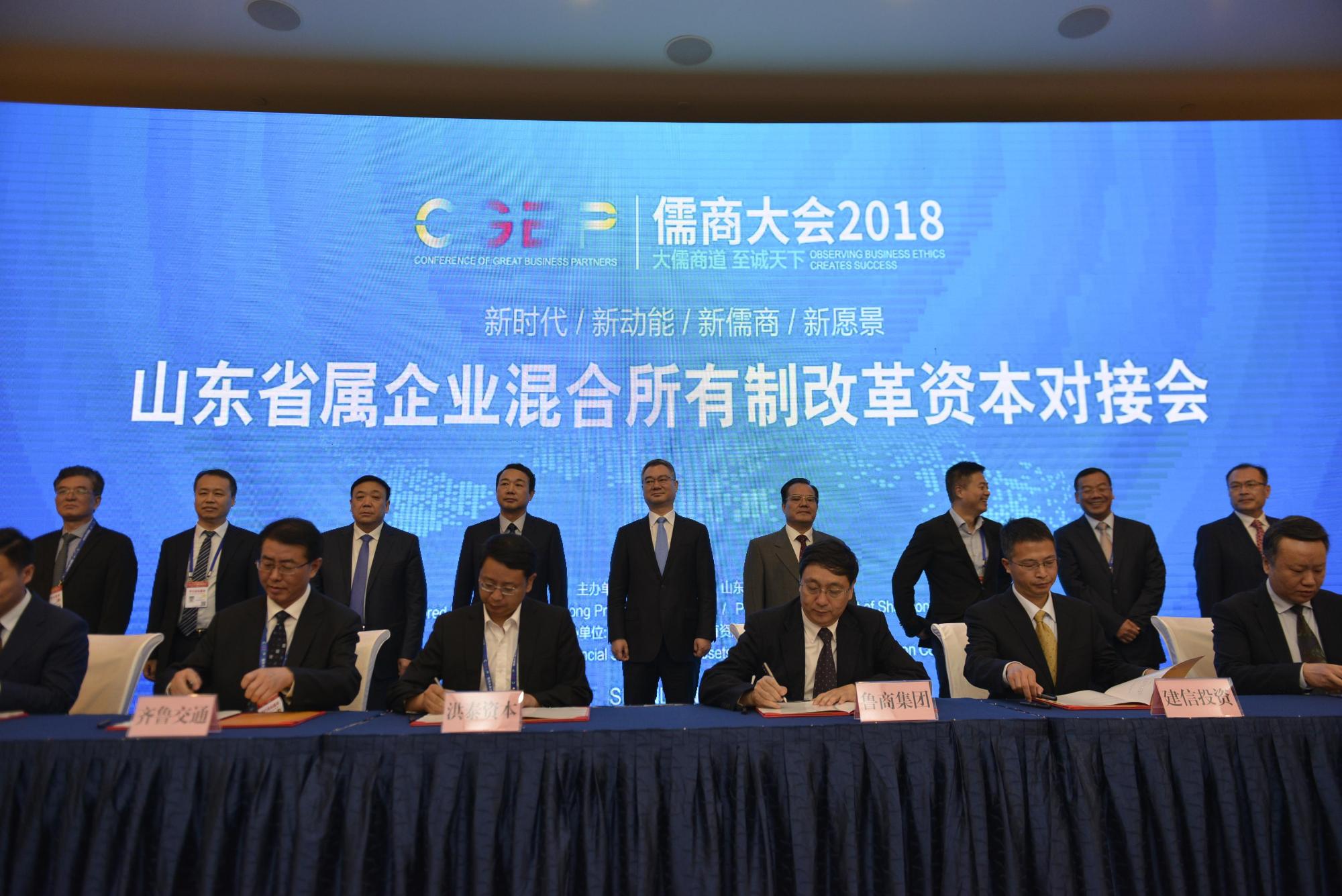 9月29日,省委常委、省委秘書長王清憲出席省國資委舉辦的“儒商大會2018-山東省屬企業混合所有制改革資本對接會議”,并見證魯商集團與洪泰資本簽約。會上,魯商集團黨委書記、董事長高洪雷推介了集團混改項目,黨委副書記、總經理凌沛學與洪泰基金合伙人、洪泰山東總部董事長李文峰進行簽約。
