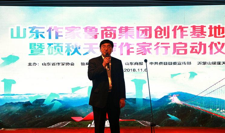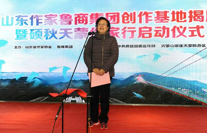 姬德君在致辭時表示,山東作家魯商集團創(chuàng)作基地的所在地臨沂費縣,地處沂蒙革命老區(qū),是中國地名文化遺產(chǎn)千年古縣、全國首批縣域“中國紅色地標”。把作家創(chuàng)作基地建在這樣一片歷史文化悠久、革命傳統(tǒng)深厚的熱土上,一定能夠引導(dǎo)廣大作家進一步樹立深入生活、扎根人民的創(chuàng)作理念,不斷創(chuàng)作推出更多更好展現(xiàn)山東氣派、齊魯風(fēng)格,為人民群眾喜聞樂見的文學(xué)精品佳作。省作家協(xié)會將以此次揭牌儀式和“碩秋天蒙作家行”采風(fēng)活動為契機,建設(shè)一支富有生機活力的文學(xué)隊伍,支持引導(dǎo)廣大作家走進魯商、走進費縣,深入采訪采風(fēng),開展文學(xué)創(chuàng)作,努力多出精品、多出人才,為建設(shè)文學(xué)強省、勇攀文學(xué)高峰貢獻新的更大力量。