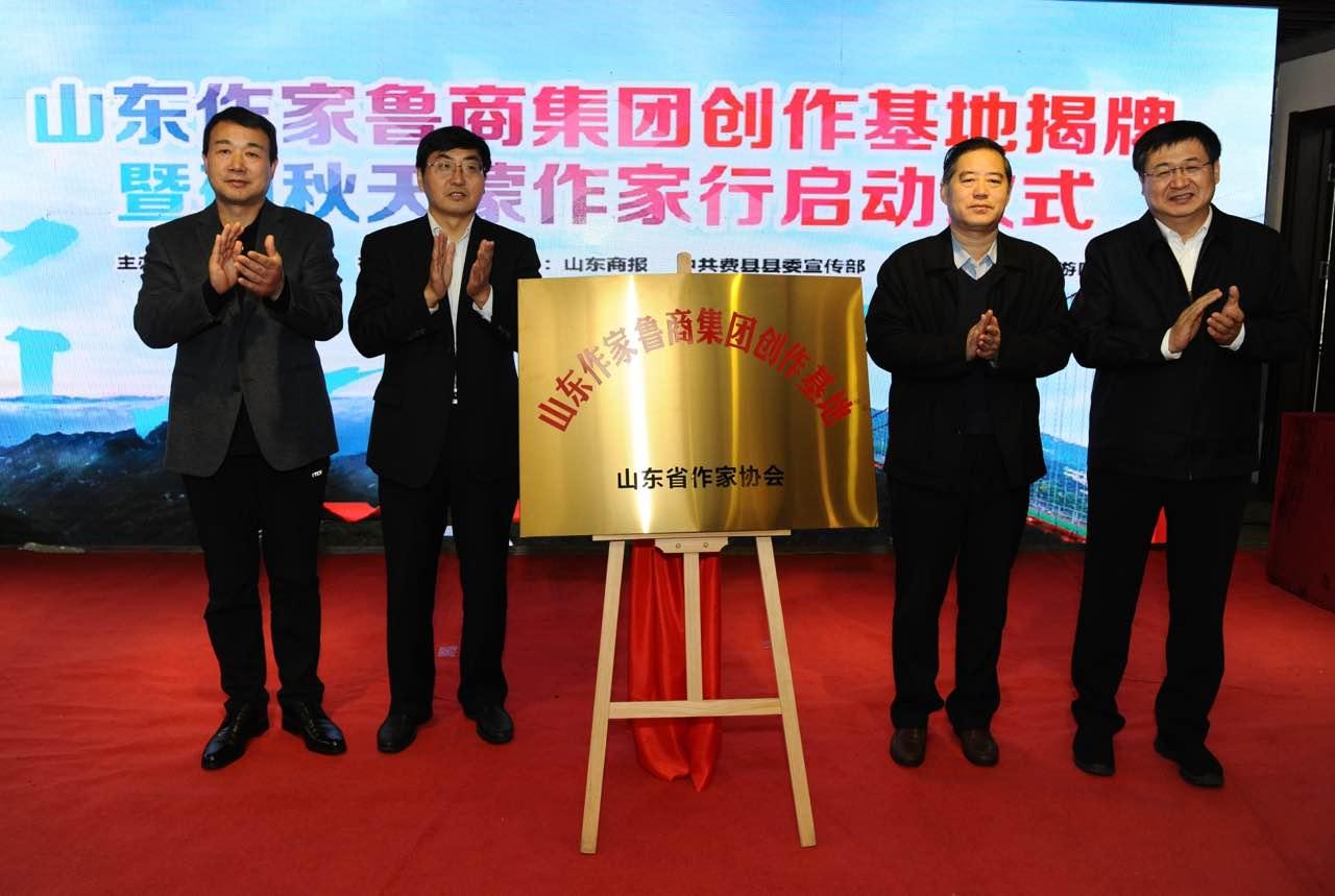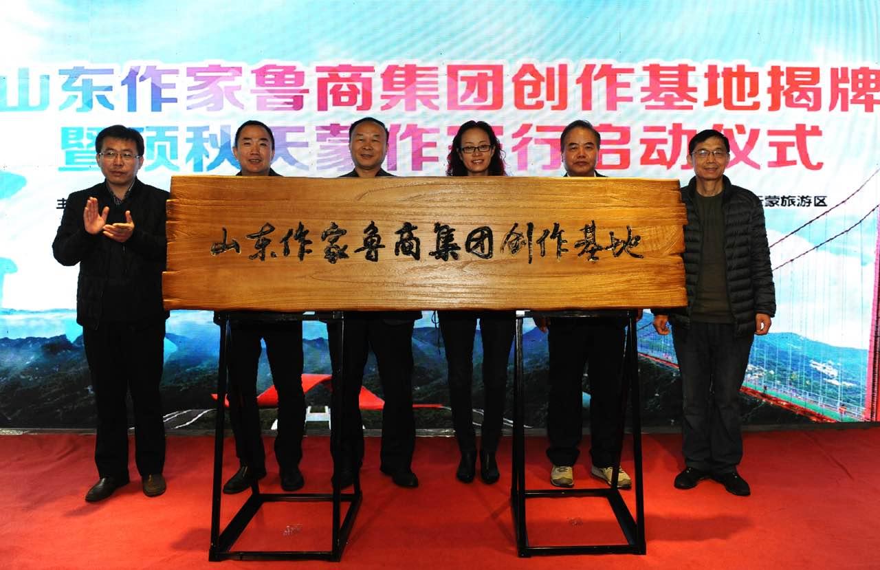 王紅勇、姬德君、高洪雷、邊峰為“山東作家魯商集團創(chuàng)作基地”揭牌。作家代表許晨、劉玉棟、鐵流、東紫、夏立君、李登建為“碩秋天蒙作家行”活動開筆。
