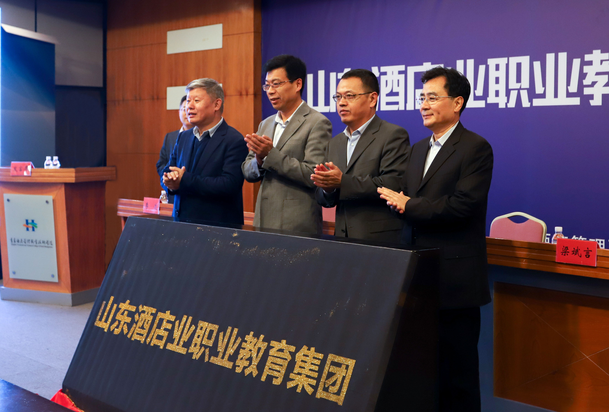 劉守亮與部分與會領導共同為山東現代酒店業職業教育集團揭牌。他指出,要開展好山東酒店業職教集團的各項活動,大力深化產教融合、校企合作,搭建好全省酒店業發展平臺,在促進我省經濟結構轉型升級,尤其是促進我省酒店服務業發展中起到積極作用。