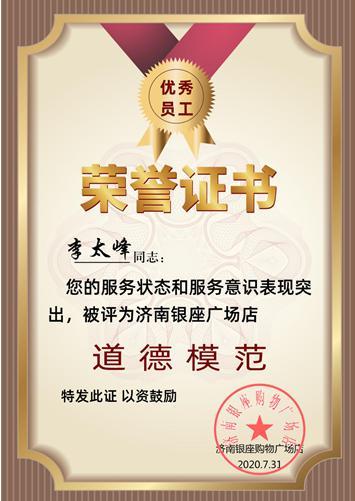 2018年,李太峰榮獲銀座廣場店“我身邊的榜樣”榮譽稱號,門店同時發(fā)起了向李太峰同志學(xué)習(xí)的倡議。這時又有人問李太峰,當(dāng)了模范又當(dāng)榜樣,什么感覺?他仍然是淡淡一笑:“俺還是好好干好自己的活吧。”樸樸素素的語言,不會豪言壯語,不會侃侃而談,有的只是腳踏實地,有的只是全心投入。