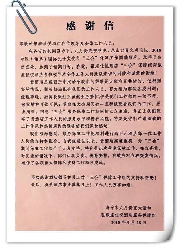 付出總有回報。經過酒店全體人員的共同努力,各項接待工作均有序開展,獲得了入住人員及重要嘉賓的一致好評。酒店共收到表揚信二十余封,圓滿完成“三會”接待工作,同時,為今后的政務接待積累了寶貴經驗,未來,曲阜銀座佳悅酒店將不斷完善,繼續提高酒店的軟硬件水平,打造濟寧的酒店業行業標桿!