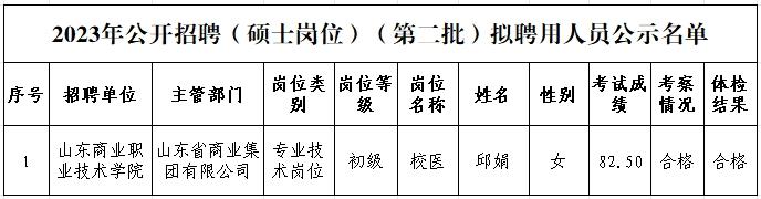 根據(jù)中共山東省委組織部、山東省人力資源和社會(huì)保障廳《關(guān)于印發(fā)2023年度省屬事業(yè)單位公開招聘工作實(shí)施方案的通知》(魯人社發(fā)〔2022〕23號(hào))和省屬事業(yè)單位公開招聘有關(guān)政策規(guī)定,按照崗位招聘計(jì)劃,山東商業(yè)職業(yè)技術(shù)學(xué)院組織完成了2023年公開招聘(碩士崗位)(第二批)工作人員考試、體檢、考察等工作,現(xiàn)對(duì)該單位擬聘用人員進(jìn)行公示。公示期為7個(gè)工作日,自2023年11月23日至2023年12月1日(不含節(jié)假日)。公示期間,如對(duì)公示人員有異議,請(qǐng)向山東省商業(yè)集團(tuán)有限公司組織人力資源部反映。反映問題要實(shí)事求是,并告知真實(shí)姓名及聯(lián)系方式。