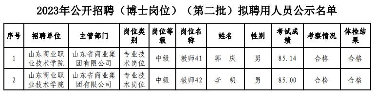 根據《中共山東省委組織部 山東省人力資源和社會保障廳關于印發2023年度省屬事業單位公開招聘工作實施方案的通知》(魯人社發〔2022〕23號)和省屬事業單位公開招聘有關政策規定,按照崗位招聘計劃,山東商業職業技術學院組織完成了2023年公開招聘(博士崗位)(第二批)工作人員考試、體檢、考察等工作,現對該單位擬聘用人員進行公示。公示期為7個工作日,自2024年1月31日至2024年2月7日(不含節假日)。公示期間,如對公示人員有異議,請向山東省商業集團有限公司組織人力資源部反映。反映問題要實事求是,并告知真實姓名及聯系方式。